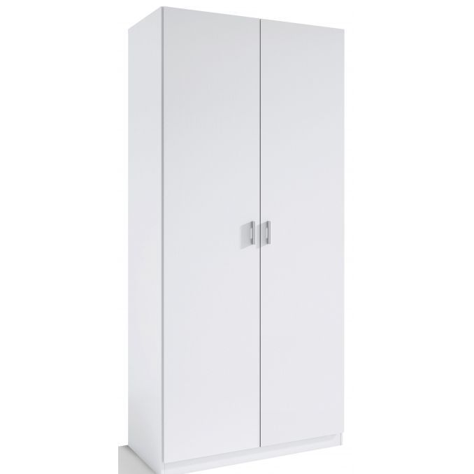 Armario fabricado con tableros de partículas de madera de densidad media de 16 mm de grosor recubiertos por una chapa sintética de color blanco hielo. Bisagras metálicas con regulación de altura con herrajes de primera calidad. Tiradores de las puertas de color plata.