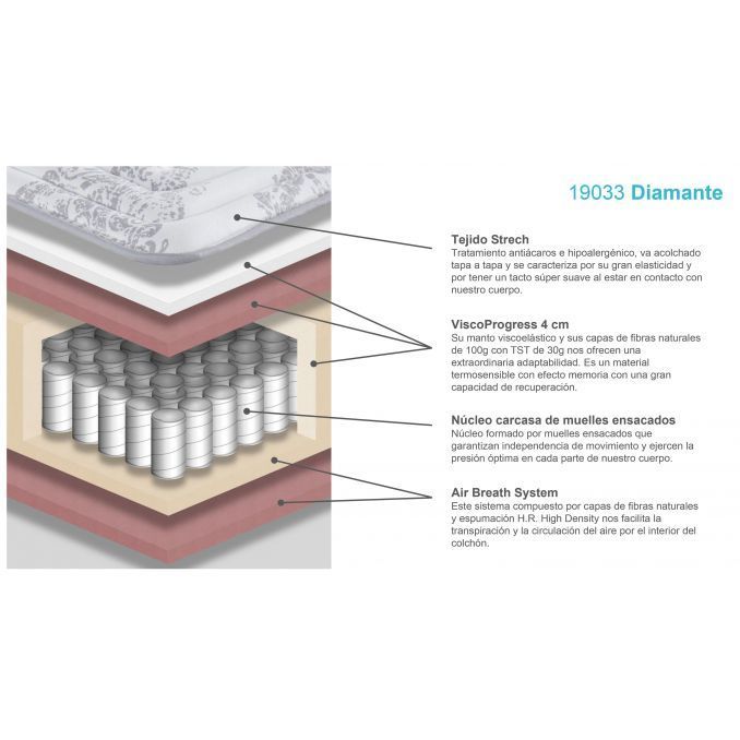 Elegir un colchón viscoelástico no es tarea fácil porque cada uno tenemos unos gustos y unas preferencias para dormir, pero una de las mejores opciones para obtener un descanso saludable y reparador son los colchones que llevan la combinación de viscoelástica y muelles ensacados como es el caso de nuestro modelo Diamante. La principal característica de este extraordinario colchón es su gran adaptabilidad, esto es debido a la capa de viscoelástica que va en el núcleo interior, este material es termosensible con efecto memoria, esto quiere decir que al dejar de ejercer presión sobre el colchón este recupera su estado inicial en muy poco espacio de tiempo. Es un modelo que distribuye el peso del durmiente y elimina los puntos de presión al estar en contacto directo con todas las partes de nuestro cuerpo, creando una sensación de ingravidez similar a como si estuviéramos flotando.
