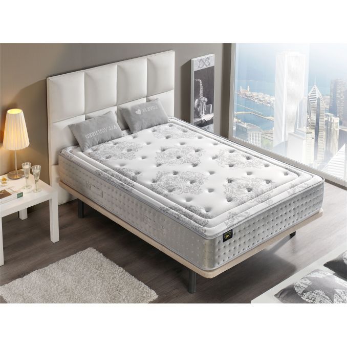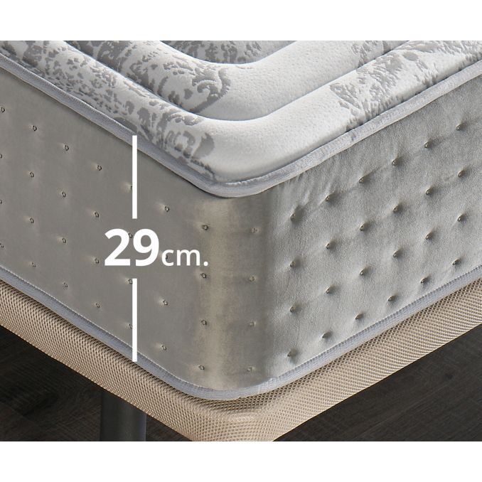 Para la fabricación de este modelo de colchón viscoelástico con muelles ensacados utilizamos materiales de primera calidad tanto en el interior del colchón como en el exterior. El tapizado es un tejido strech adamascado, antiácaros e hipoalergénico que va acolchado tapa a tapa, este tejido se caracteriza por su gran elasticidad y por tener un tacto muy suave, es muy transpirable y evita que que se acumule la humedad, de esta forma se evita la aparición de ácaros y demás microorganismos que son nocivos para la salud. El núcleo interior está formado por muelles ensacados que garantizan independencia de movimientos y ejercen la presión ideal en cada parte de nuestro cuerpo. Estos muelles van arropados por un manto de viscoelástica con varias capas de fibras naturales de 100 gramos y espumación H.R, una mezcla perfecta para conseguir el mejor descanso.