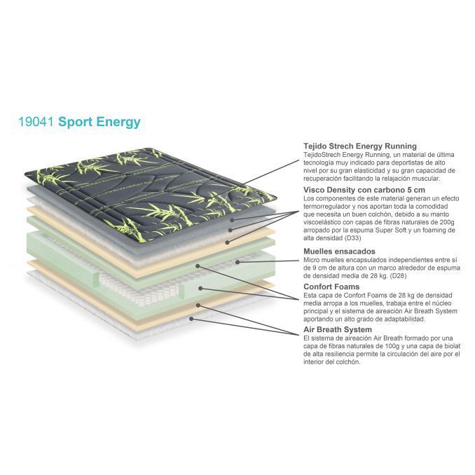 El colchón muelles ensacados modelo Sport Energy se ha diseñado para mejorar la calidad del sueño y para facilitar la recuperación muscular, esto se consigue con la combinación de los mejores materiales como el Visco Density con filamentos de carbono de 5 cm y los muelles ensacados de 9 cm de altura.