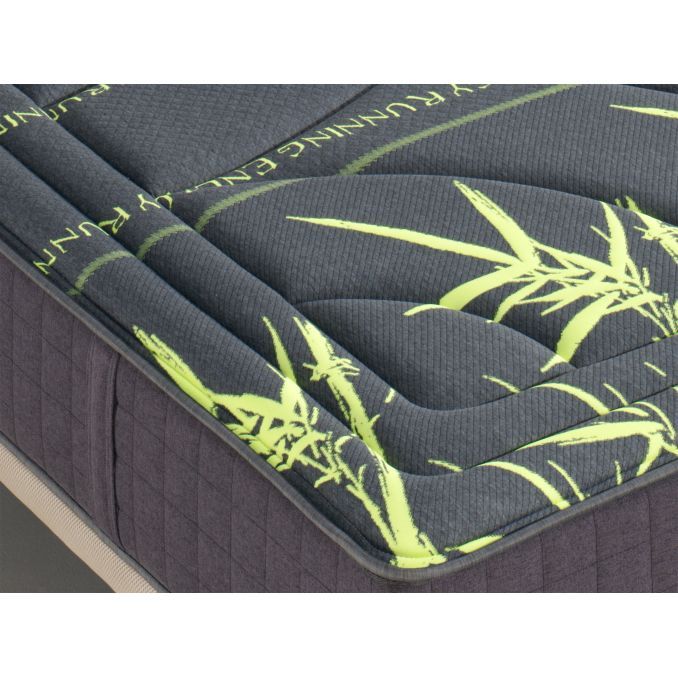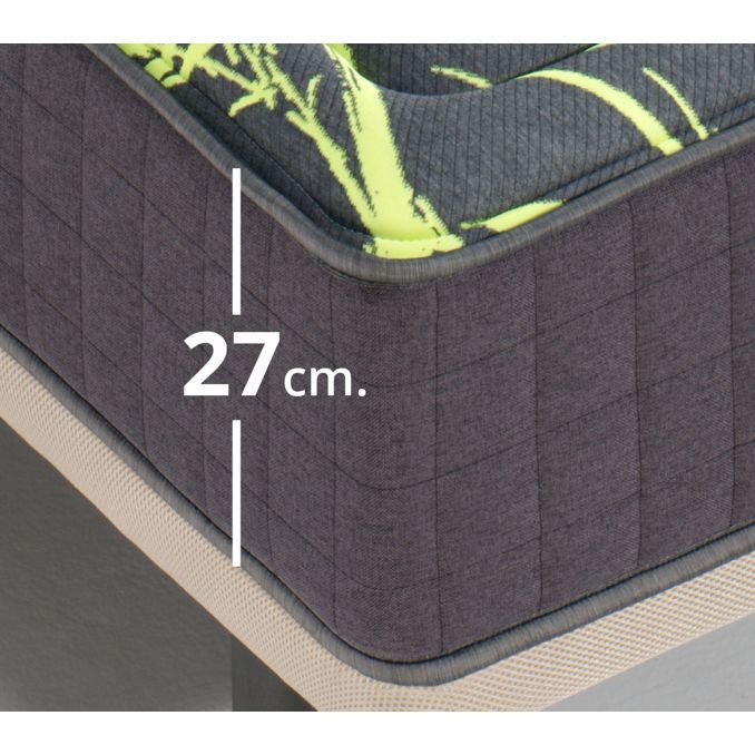 Terminado en una altura de 27 cm y en una combinación de colores de última tendencia como son el gris oscuro con el verde pistacho, se compone de dos partes independientes separadas por un núcleo de muelles ensacados con refuerzo perimetral de 30 kg y unas tapas de Confort Foams de 28 kg con una altura de 6 cm que arropan a los muelles para su perfecta alineación. Estos muelles van totalmente independientes y metidos en unas bolsas de saco formando una estructura totalmente flexible y al mismo tiempo indeformable, aportantando una independencia total de lechos y un equilibrio perfecto de las presiones ejercidas por el cuerpo.