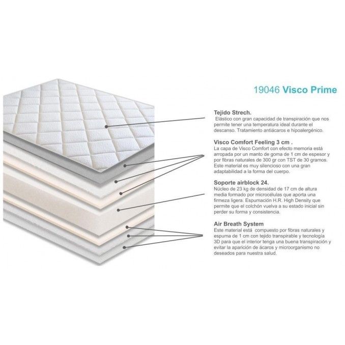 La capa de Visco Comfort Feeling está arropada por un manto de goma de 1 cm de espesor y por fibras naturales de 300 gramos, combinadas con TNT de 30 gr. Este material cuenta con grandes ventajas. Se caracteriza por ser muy silencioso, elimina los puntos de presión y se adapta a la perfección a la forma del cuerpo. La cara B del colchón viscoelástico modelo Visco Prime lo forma un material denominado Air Breath System. Este material cuenta con tejido transpirable y tecnología 3D para que el interior tenga una buena transpiración y se eviten así las humedades y la aparición de ácaros u otros microorganismos que son nocivos para nuestra salud.
