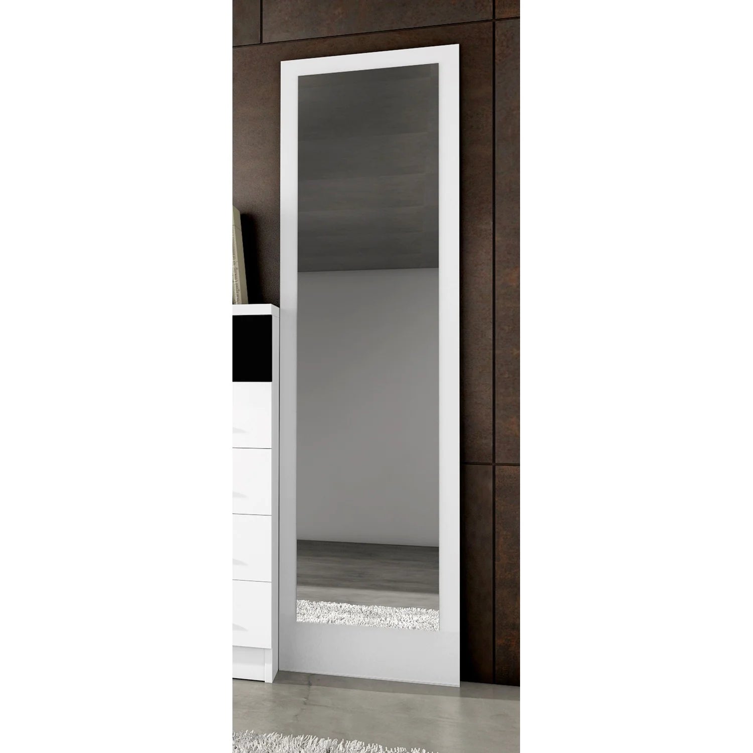 Este espejo vestidor tiene una medida de 44 cm de ancho x 170 cm de alto x 1.6 cm de grosor, está fabricado con tablero de partículas de madera recubierto de chapa sintética de color roble cambrian. La luna que lleva mide 40 cm de ancho x 160 cm de altura. Se puede fabricar también en color blanco liso y en color cerezo.