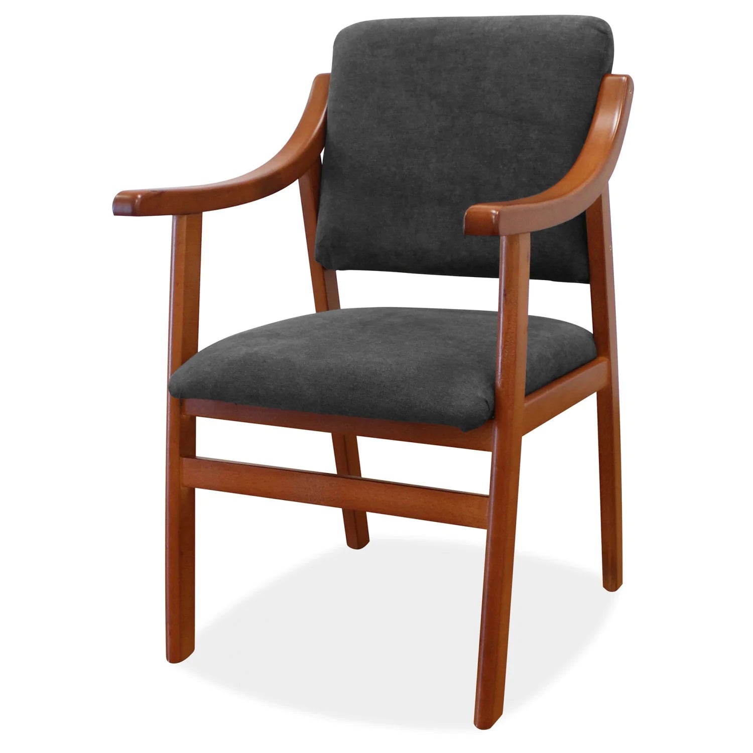 Silla comedor con apoyabrazos fabricada en haya natural ecológica de color color cambrian con una gran terminación en todos los acabados. Asiento y respaldo acolchado tapizado en chenilla de color gris marengo de gran resistencia y confortabilidad.