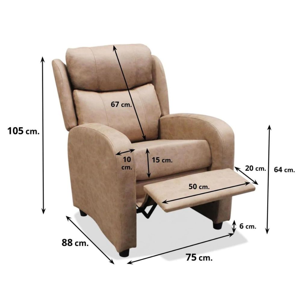 Nuestro sillón relax modelo Luna tiene una medida total de 75 cm de ancho x 105 cm de alto x 88 cm de fondo y está fabricado con buenos materiales tanto en el interior como en el exterior. Su armazón es de madera de pino combinadacon placas de alta resistencia y su bastidor es metálico pintado con pintura epoxi de color negro antioxidante.