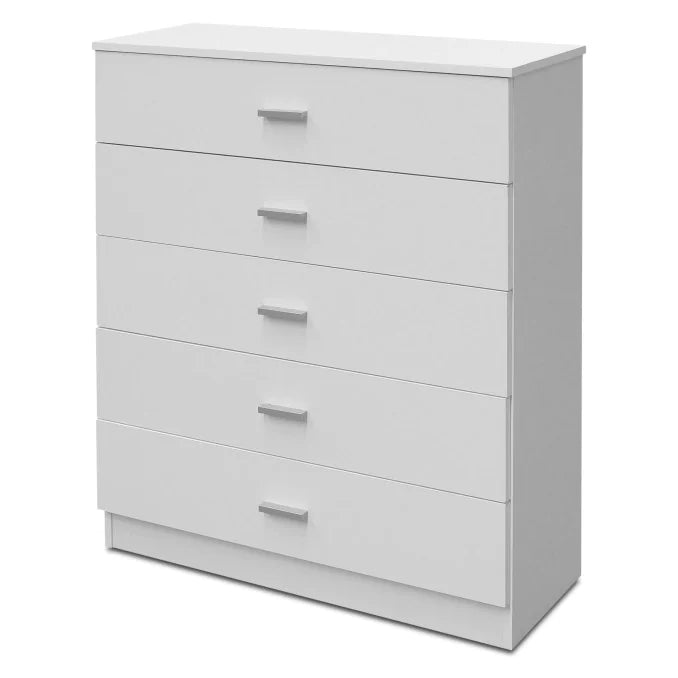 El sinfonier está fabricado con tableros de partículas de madera de densidad media de color blanco liso o marron de 16mm de grosor. Guías en los costados laterales y tiradores ABS de color plata.