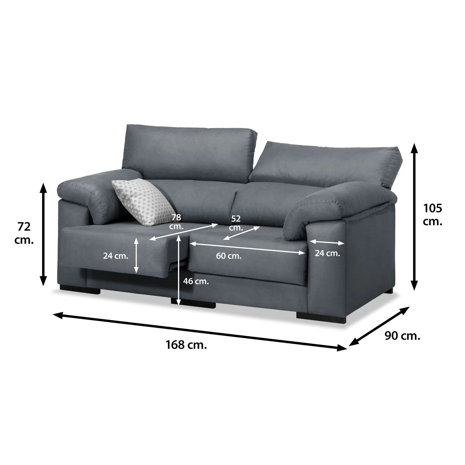 El sofá modelo Harry es una buena opción si estás buscando un sofá 2 plazas que no te salga muy caro y que tenga una gran comodidad. Tiene una medida de 168 cm x 90 cm y está formado por dos brazos de 24 cm de ancho x 72 cm de alto y por dos asientos amplios de 60 cm x 24 cm de altura cada uno para que se puedan sentar dos personas muy cómodamente.