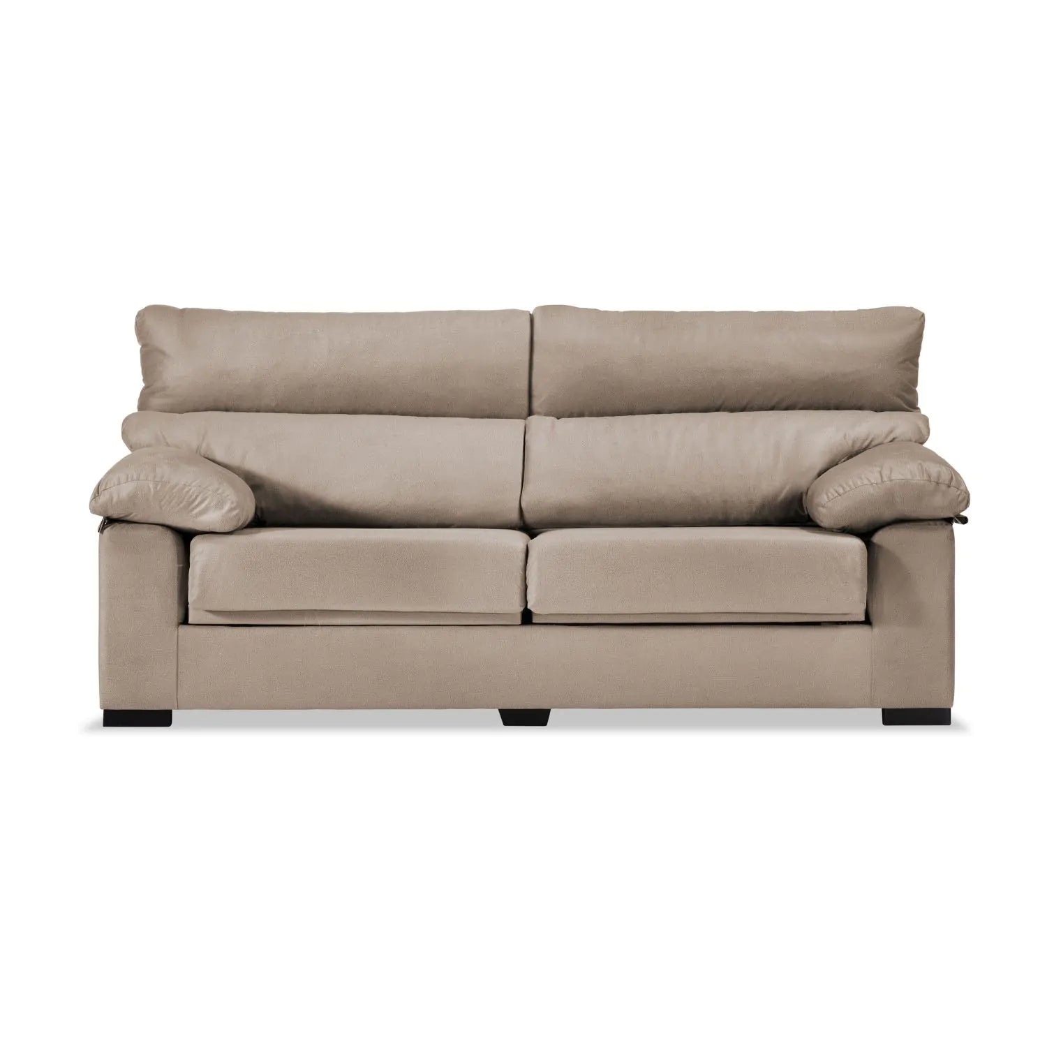 Este modelo de sofá es muy demandado por nuestros clientes porque tiene un precio inigualable y por su gran diseño y comodidad. Tiene una medida de 150 cm x 90 cm de fondo y está tapizado en una de las mejores telas con tratamiento antimanchas Acualine® de color beige 100% poliéster, se trata de una microfibra muy suave al tacto que ha pasado estrictos controles de calidad para garantizar su resistencia a la abrasión con más de 30.000 ciclos.