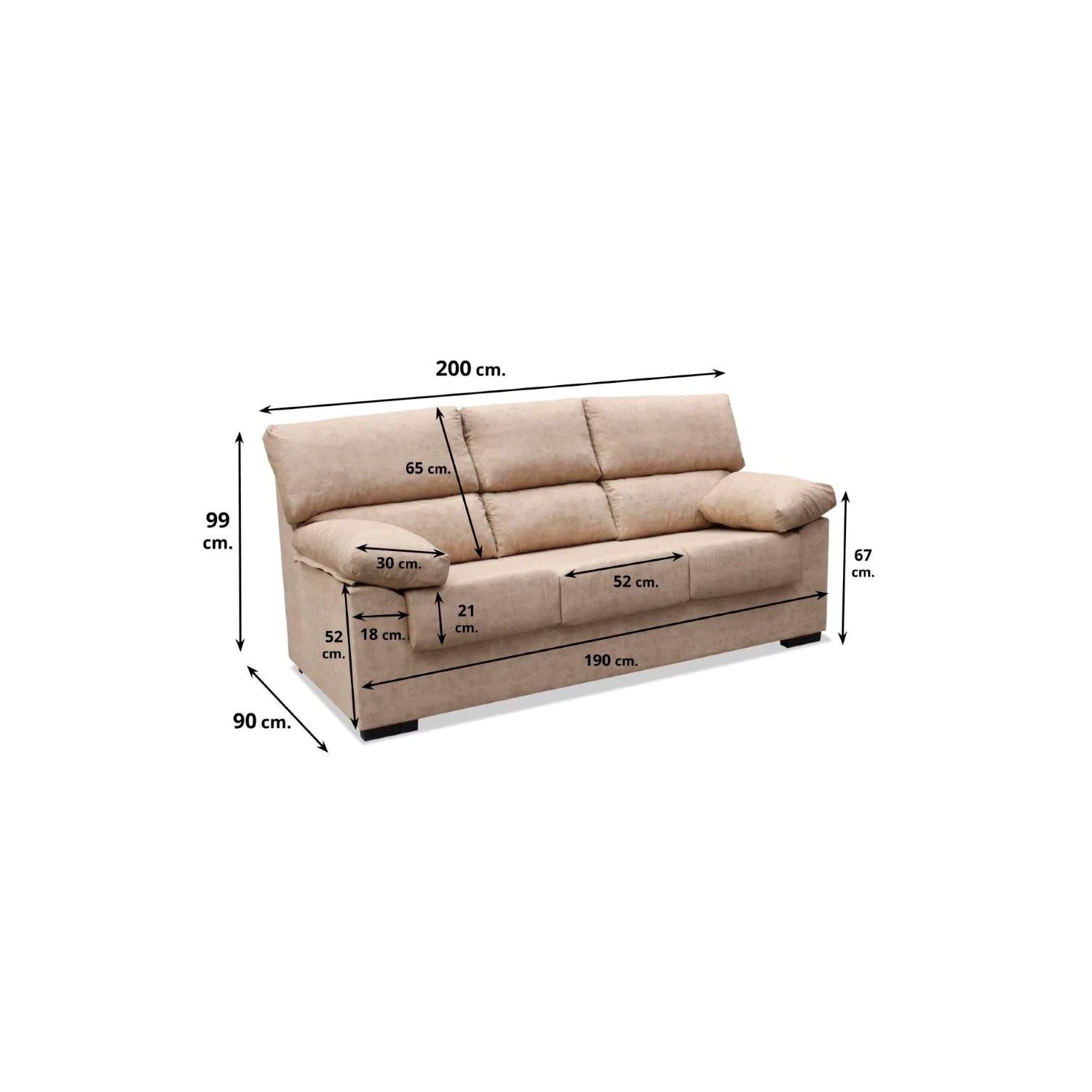 ¿Qué es lo que le diferencia de otros modelos que hay en el mercado? Principalmente su buena relación calidad-precio y su diseño con brazos estrechos de 18 cm con 3 asientos amplios individuales de 52 cm de ancho con un fondo útil de 47 cm y una altura total hasta el suelo de 47. Los dos brazos tienen una altura de 67 cm y llevan apoyabrazos.