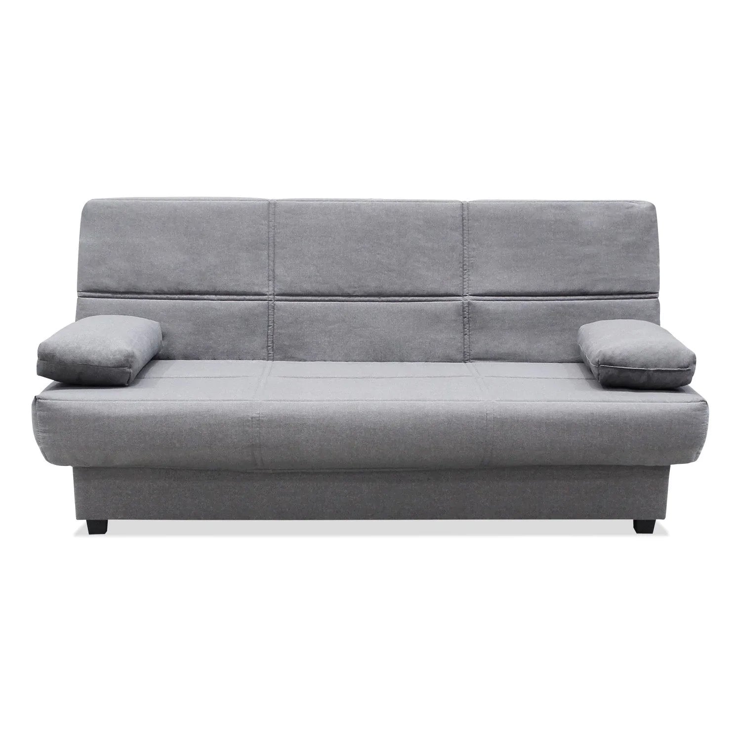 Sofá cama tapizado en loneta ajustable de color gris. Espuma de asiento y respaldo de 25 kg de densidad. Desenfundable para que la funda se pueda meter en la lavadora. Armazón reforzado con listones de madera.