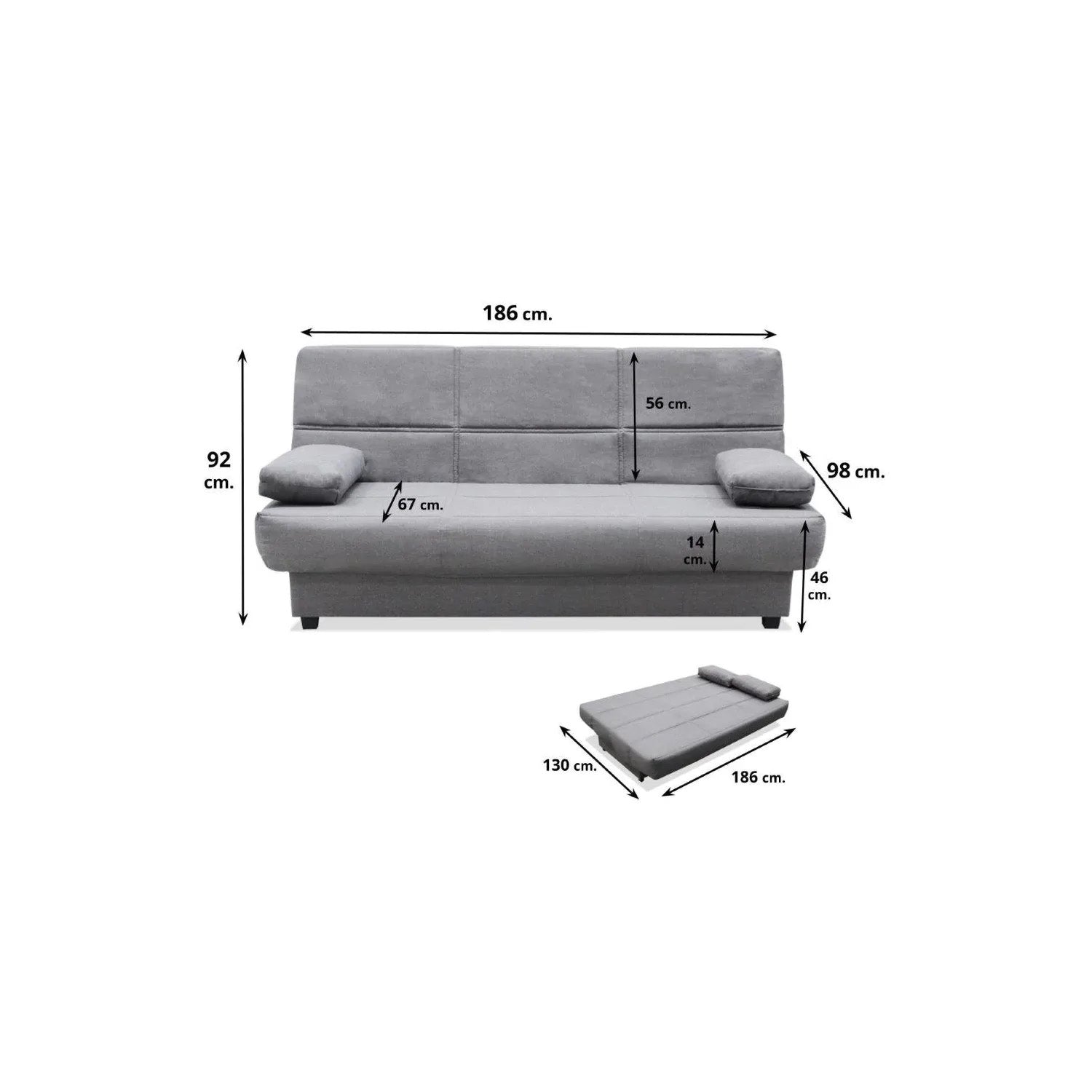 Este modelo tiene una medida total cuando está cerrado de 186 cm de largo x 98 cm de fondo x 92 cm de alto. Consta de dos espumas individuales de 25 kg de densidad con una altura de 14 cm, una para el asiento y otra para el respaldo para favorecer una sentada firme tanto para cuando deseemos utilizar como sofá como cuando lo queramos utilizar como cama, al abrirlo se convertirá en una cama para dos personas de 130 cm de ancho x 186 cm de largo.