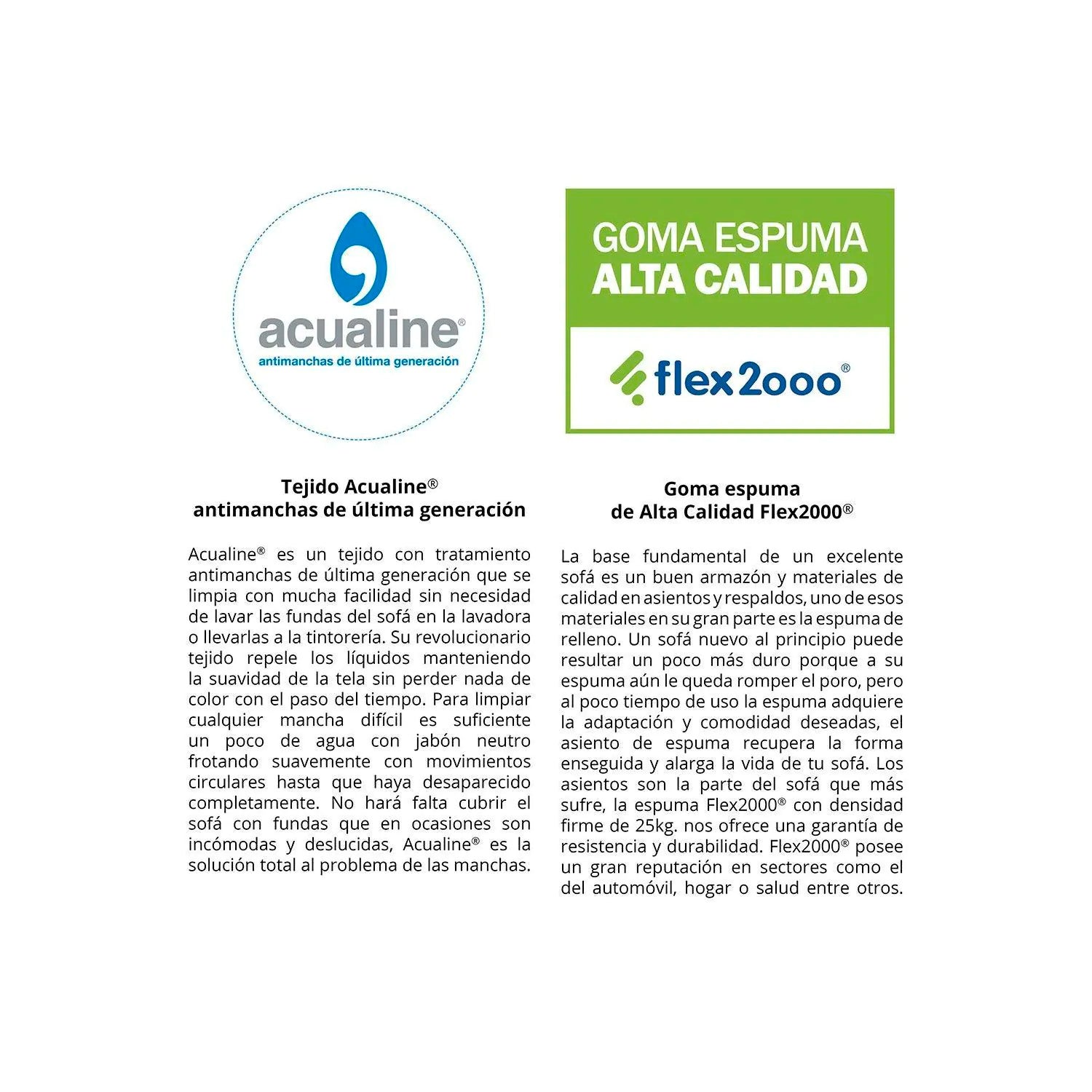 Sofá cama con sistema nido fabricado en estructura de madera de pino con placas de alta resistencia metálica. Las espumas de los asientos son de 25 kg de densidad firmes y resistentes, los respaldos son de fibra hueca siliconada con cremalleras para poder desenfundarlos para lavar.