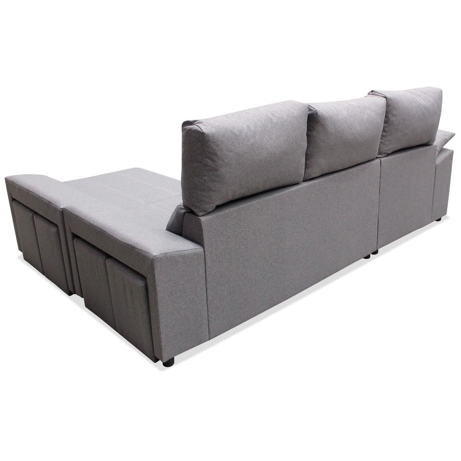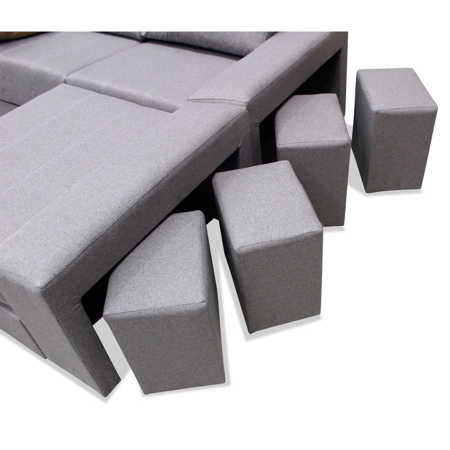 Tanto en el brazo del puff movible como en el brazo visto de frente derecho del sofá llevan incorporados dos taburetes de 35 cm de ancho x 41 cm de alto x 26 cm fondo. Estos taburetes no ocupan espacio y nos van a venir muy bien si tenemos más gente en casa, así tendremos donde sentarles sin tener que coger ninguna silla de cualquier otro sitio.