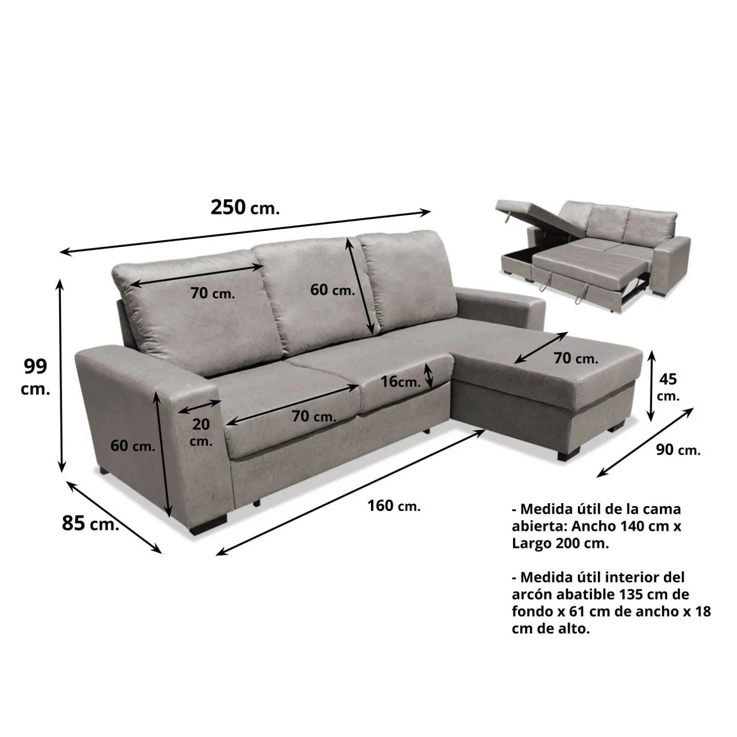 Este sofá cama chaise longue abatible tapizado en microfibra con tratamiento antimanchas de color gris tiene el detalle del arcón abatible de gran capacidad, para que podamos guardar todo lo que necesitamos como mantas, juguetes, revistas y todos el resto de objetos para que no estén por medio del salón. Este arcón se abre y se cierra mediante unos hidráulicos y tiene un hueco útil interior de 135 cm de largo x 66 cm de ancho x 18 cm de altura.