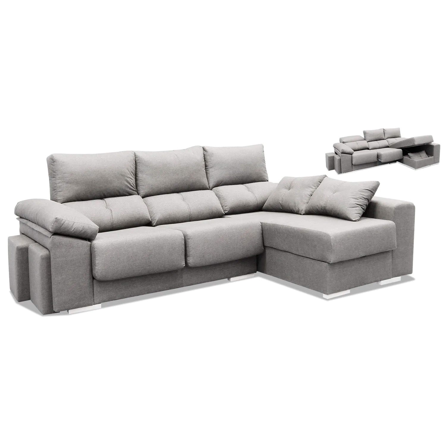 En el caso que nos ocupa ahora, queremos comentar que este Sofá chaise longue con arcón abatible y 2 taburetes combina un sofá de 2 plazas con un asiento largo que nos sirve para poder estar tumbados con las piernas estiradas garantizando un extra de comodidad. Tiene una medida de 250 cm x 160 cm x 100 cm de altura y está tapizado en una microfibra de color gris desenfundable.