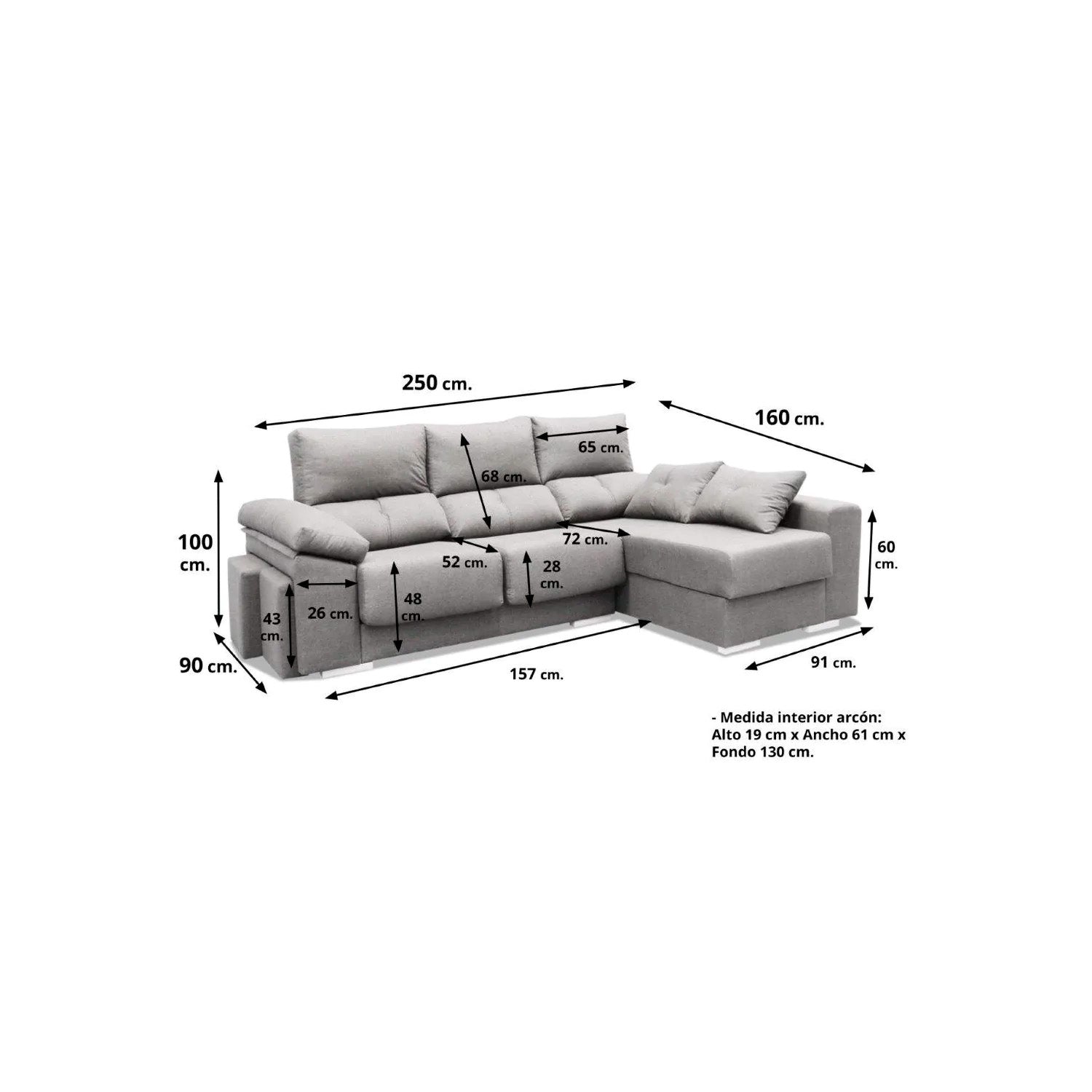 El módulo de la chaise longue lleva un brazo recto de 26 cm de ancho x 60 cm de altura, este módulo lleva un arcón abatible con unas medidas interiores de130 cm de fondo x 60 cm de ancho y 20 cm de alto, en él podremos guardar las mantas que usamos en invierno, cojines decorativos, juguetes incluso de los niños o cualquier otra cosa que no queramos que estén a la vista o por el medio del salón que tanto afean la decoración del comedor.