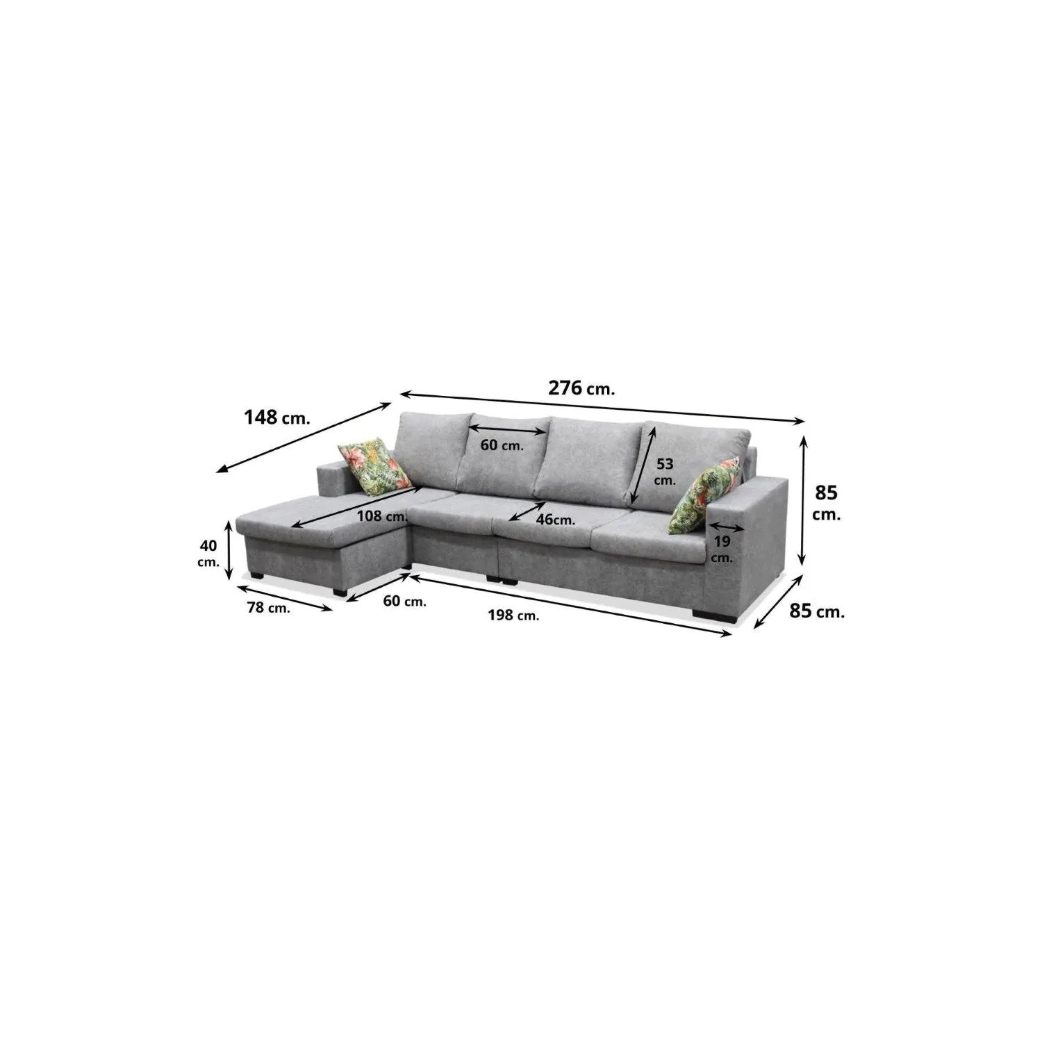 La zona del asiento largo lleva un puff suelto de 78 cm de ancho x 60 cm de fondo que se puede poner a un lado o a otro según tengamos la distribución del salón tal y como hemos comentado anteriormente, pongas el puff donde lo pongas siempre te van a quedar libres 3 asientos. Los dos brazos son de líneas rectas con una medida de 19 cm de ancho x 57 cm de alto x 83 cm de fondo, el brazo de la zona de la zona de la chaise longue no llega hasta el final del asiento para que tengamos más espacio para poder sentarnos o tumbarnos.