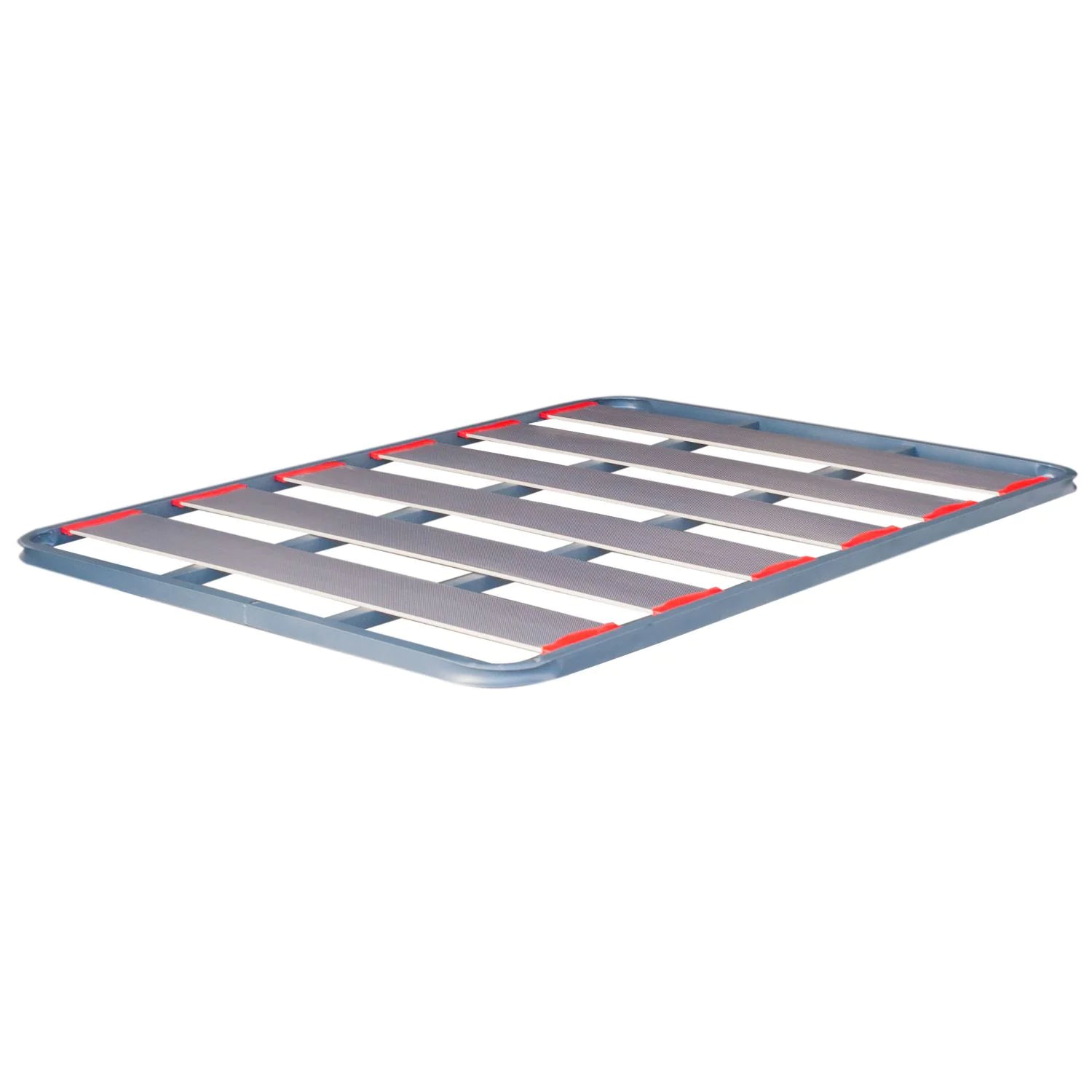 Somier fabricado con un bastidor de tubo de acero de 40x30 mm pintado con pintura Epoxi texturizada y formado por 8 láminas de madera curvada de 12 mm con tacos de polietileno en los extremos para evitar ruidos durante la noche. Barra central de refuerzo de 40x30 mm en medida de 105 cm y de 50x40 mm en medidas de 135 y 150 cm. Posibilidad de añadirle patas (opcionales).
